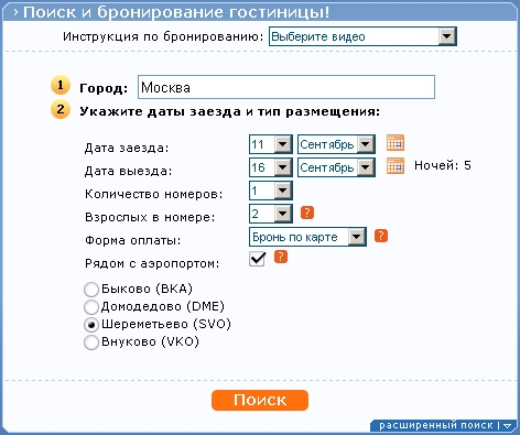 «Бронь без карты» - в этом случае Вам не понадобится кредитная карта, бронирование осуществляется по полной предоплате наличными. Важно помнить, что забронировать отель по полной предоплате можно не менее, чем за 10 дней до даты заезда в отель. Полная предоплата производится банковским переводом или через терминал по приёму платежей. Графа «Рядом с аэропортом» не обязательна, но отметив это поле и выбрав интересующий Вас аэропорт, Вы получите список отелей, расположенных вблизи него. Вы можете воспользоваться расширенным поиском и ввести дополнительные параметры: название и адрес отеля (на английском языке), количество детей в номере (на момент заезда ребенку должно быть неполные 12 лет), ценовую категорию номеров и принадлежность отеля к гостиничной цепочке. Также Вы можете определить список обязательных удобств в отеле. После того, как Вы заполнили форму, нажмите кнопку «Поиск».