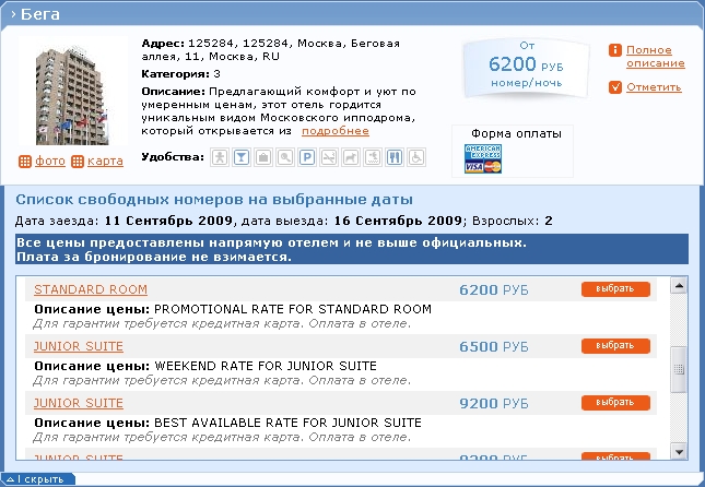 В нижней части блока отеля находится кнопка «Показать цены». Нажав на неё или на саму цену, Вы увидите все предложения от отеля на выбранные Вами даты. Здесь же содержится краткое описание номера и тарифа, а также информация о том, с какой целью будет использоваться банковская карта: для гарантии или предоплаты. После того, как Вы определились с гостиницей и номером, нажмите кнопку «Выбрать».