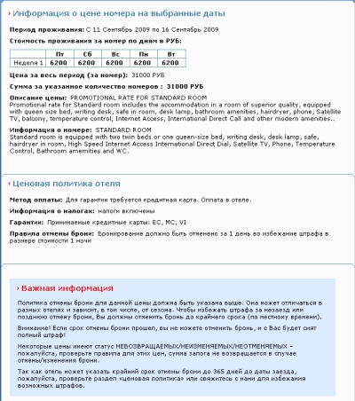 - подробное описание цены и стоимость проживания - ценовая политика отеля, включая информацию о налогах, гарантиях, правилах предоплаты и отмены бронирования Прежде чем забронировать отель, обратите особое внимание на правила отмены брони. Если в описании тарифа указано NO CANCELLATION, NON REFUNDABLE, NON CHANGABLE - отменить бронь и вернуть деньги НЕВОЗМОЖНО!!! После того, как Вы ознакомились со всей информацией о бронируемом номере, нажмите кнопку «Продолжить».
