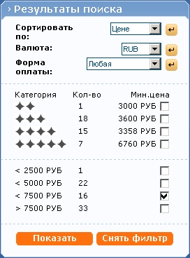 2. Выбор отеля оглавление На экране появится список отелей, соответствующих параметрам поиска. В левом блоке «Результаты поиска» Вы можете выбрать метод сортировки отелей и валюту, в которой будут выводиться цены. В этом же блоке Вы можете настроить фильтр отеля по категории и ценовому диапазону.