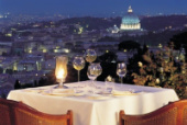 Rome Cavalieri (Рим). Ресторан La Pergola на крыше отеля, возглавляемый шеф-поваром Хайнцем Беком (Heinz Beck) - единственный обладатель трех звезд от Мишлен в городе. Каждый вечер, в зависимости от количества броней, вид ресторана меняется, но здесь никогда не накрывают более 65 столов. Попробуйте жареные устрицы La Perle Blanche с соусом из петрушки, угольную рыбу с маринованными анчоусами или молочного поросенка.