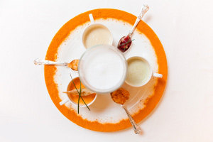 §Нежная полента с лесными грибами, крутоны с сыром горгонзола и трюфельным маслом, капуччино из лесных грибов и самса