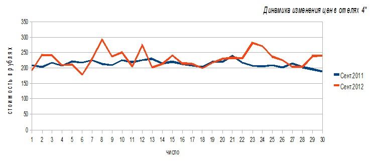 Отели средней ценовой категории показали более гибкий подход к тарифообразованию в сентябре 2012. Если годом ранее средние цены на проживание в трехзвездочных отелях Северной столицы были практически одинаковыми в течение всего месяца (небольшие колебания в пределах ста рублей между стоимостью проживания в течение недели и на выходных), то в нынешнем году такого равенства цен не наблюдается.
