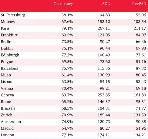 Что касается загруженности европейских отелей, отмечают специалисты PricewaterhouseCoopers, то в 2012 наибольшем спросом пользовались отели Парижа, Лондона и шотландского Эдинбурга. Наибольший рост отрасли в 2013 году будет наблюдаться в 7 европейских городах. Санкт-Петербург, Париж и Эдинбург покажут устойчиво стабильное повышение показателей. Москва, Дублин , Берлин и Франкфурт покажут незначительное увеличение роста.