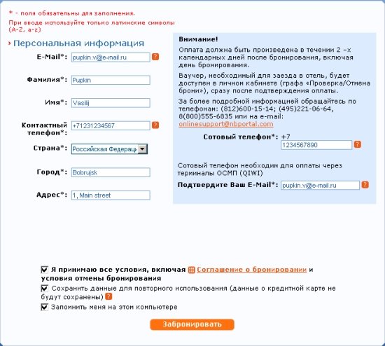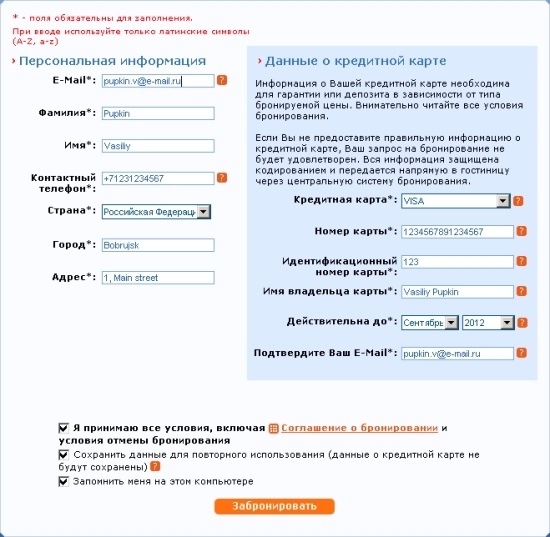 На экране появится форма, в которую необходимо ввести Ваши личные данные и данные кредитной карты (так же, как написано на карте). Данные вводятся только латинскими буквами! Безопасность передачи данных о кредитной карте обеспечивается SSL сертификатом шифрования. Ознакомьтесь с соглашением о бронировании и нажмите кнопку «Забронировать».