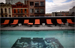 Роль произведений искусства, размещенных в гостинице, на этом не заканчивается. В ресторане можно увидеть инсталляцию Питера Хейли: блестящие металлические прямоугольники сияют на сером фоне. А на террасе на третьем этаже находится бассейн, на дне которого выложены три фотографии Энди Уорхола работы Джерарда Маланги из серии «Andy Warhol: Portraits of the Artist as a Young Man».