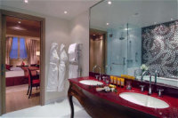 Бронзовые напольные лампы и хрустальные люстры, а также предметы интерьера, выполненные в насыщенных рубиновых и аметистовых цветах, контрастируют с общим дизайном номера в нейтральных, пастельных тонах. Стены ванной комнаты неизменно покрывает прекрасная мозаика, а вся мебель выполнена в красно-коричневых тонах и сверху скрыта под стеклом рубиново-красного цвета.