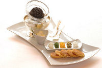 Открывают меню предложение закусок и сет из блюд с икрой. Сет «Икра со всего мира» удивит даже самых заядлых «кавьяроманов»: здесь и скрембл с черной икрой, и картофельный муслин с икрой кеты, а также копченый лосось на хрустящем картофеле Рёсти с черной икрой, и в завершение - традиционная русская икра с блинами, сметаной и рюмкой водки. Среди закусок отдельного внимания заслуживают сашими из тунца с песто из кориандра, карпаччо из говядины Ангус с маринованными артишоками и свежий речной лосось на лимоне, перце и масле с укропом, который готовят и разделывают на глазах у гостей.