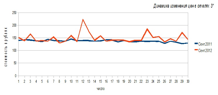 Отели средней ценовой категории показали более гибкий подход к тарифообразованию в сентябре 2012. Если годом ранее средние цены на проживание в трехзвездочных отелях Северной столицы были практически одинаковыми в течение всего месяца (небольшие колебания в пределах ста рублей между стоимостью проживания в течение недели и на выходных), то в нынешнем году такого равенства цен не наблюдается.