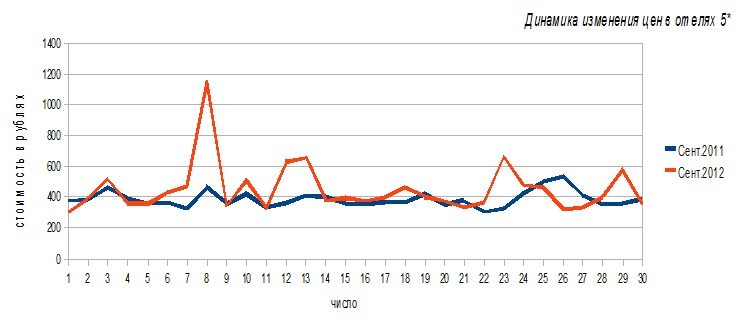 Однако в сентябре 2012 цены в отелях высокой категории фактически держались на одной отметке (колебания в 0,3 % крайне незначительно) и среднесуточная стоимость проживания составляла порядка 6900 рублей. Также в отличие от 2011 года в 2012 году сложилась обратная ситуация с тарифами в течение недели и на выходных. Так, среднесуточная стоимость проживания в будний день составляет порядка 6600 рублей, в то время, как на выходных цена поднимается в среднем на 10%. Таким образом, минувший сентябрь показал, что все больше путешественников готовы останавливаться в четырехзвездочных отелях, и категория отелей перестает быть сугубо «бизнес-туристической».