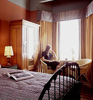 -A1Q ROOM WITH ONE QUEEN BED AND FUTON, MAX 3 * * * * * * * * * * * * * * * * * * -SOPHISTICATED AND STRIKINGLY DECORATED ROOMS FEATURE GAUZE-DRAPED CANOPIES OVER EVERY QUEEN BED, EUROPEAN WARDROBES, PRIVATE BATHROOMS WITH SHOWERS, BISTRO TABLE WITH WICKER CHAIRS, PLUS *INDIVIDUAL HEATING *BATHROOM AMENITIES *CABLE TV WITH REMOTE *HAIR DRYER *PHONE WITH MODEM JACK *ALARM CLOCK/RADIO -NOTE: NONSMOKING ROOMS ARE ON A REQUEST BASIS ONLY. SORRY, GUEST ROOMS ARE NOT SPECIALLY EQUIPPED FOR THE PHYSICALLY CHALLENGED.